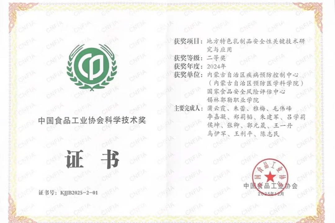 2025年12月,第二十三届中国食物平安大会暨2025全国食物工业科技前进大会正在隆沉召开。由自治区疾病防止节制核心尝试核心牵头申报的科研项目《处所特色乳成品平安性环节手艺研究取使用》荣获“中国食物工业协会科学手艺”二等。并获得了国度级行业权势巨子机构的高度承认。此项荣誉既是对过往工做的必定,更是对将来研究的敦促。继续慎密环绕国度和自治区食物平安计谋需求,深化科研立异,加快,勤奋产出更多具有前瞻性和适用价值的科研,帮力“健康”扶植贡献更多科技力量。